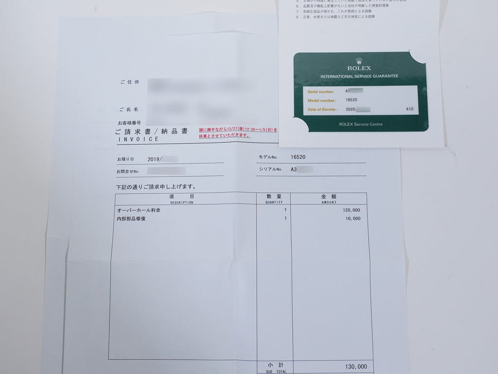 | 付属品 | Warranty card; international service warranty card; box; booklet; pass case; calendar; tag; chronometer tag; extra links; bezel cover; repair invoice; invoice |