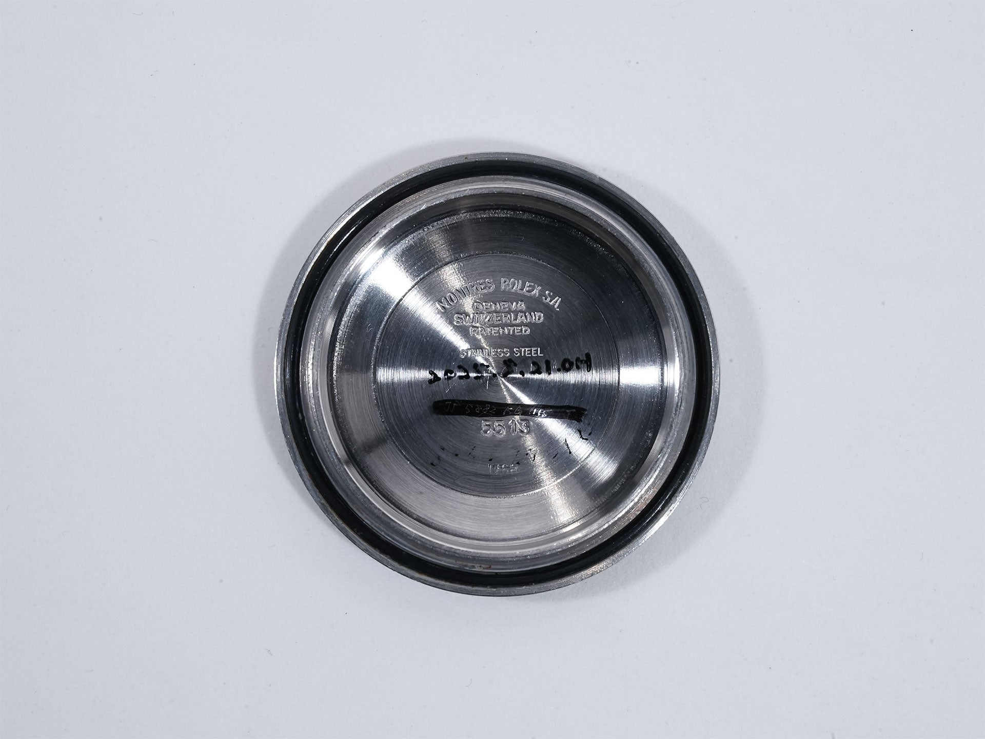 ■概要 英国軍のオーダーにより「Ref.5513」をベースに軍仕様として製造されたサブマリーナー。時針に視認性の高い剣型のソード針、秒針にアロー針を採用し、回転ベゼルには1分刻みのメモリが設けられています。破損したり、音を立てる危険性があるブレスレットを装着できないよう、横穴を塞いでバネ棒を溶接しているのが特徴です。ダイヤル6時位置の「T」マークは、トリチウム夜光の意味。ケースバックには軍内の保管場所とシリアル、軍用官有物である証の「ブロードアロー」を刻印。軍支給品ゆえに市販されておらず、ロレックスでは異例と言える専用リファレンス「Ref.5517」も存在。流通する機会が滅多にないレアモデルです。