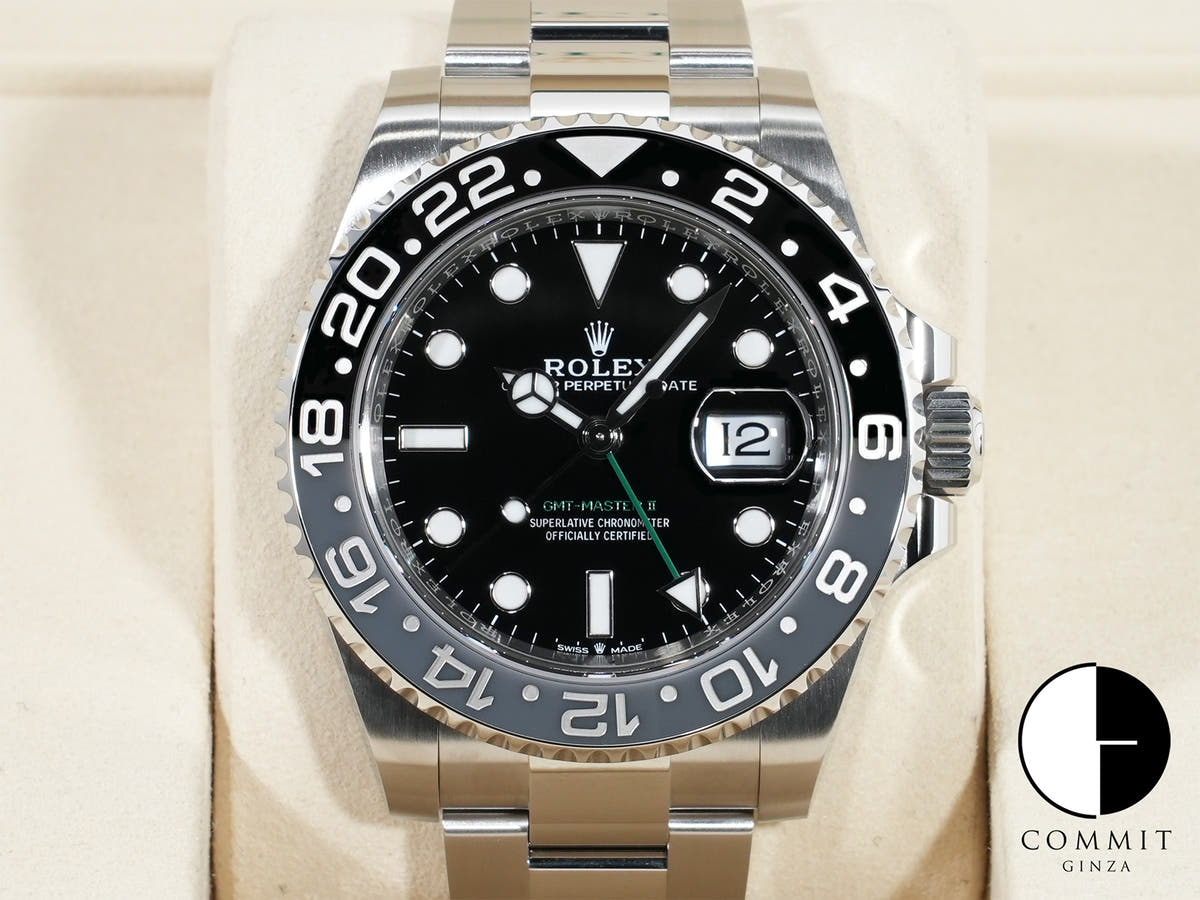 新作GMTマスターⅡのベゼルカラーはブラック×グレーの2トーンベゼルで、グレーの部分はデイタイムを示しており、ブラックの部分はナイトタイムを示しております。