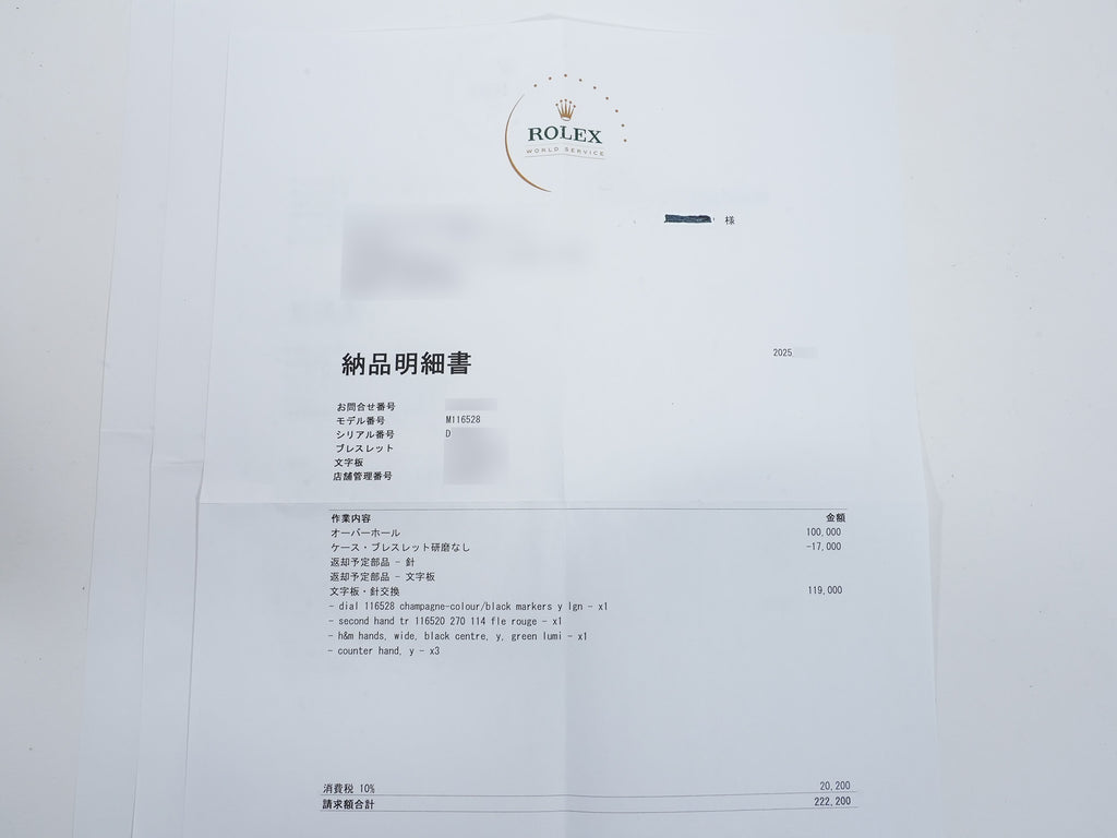 | 付属品 | 保証書;国際サービス保証書;箱;冊子;パスケース;クロノメータータグ;余りコマ;ベゼルカバー;修理見積書;文字盤、針 |
