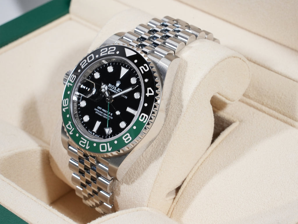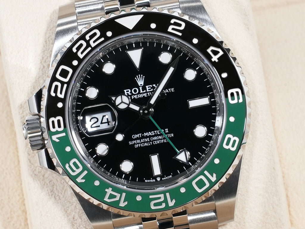 今までの『GMTマスター』には存在しなかった、グリーン x ブラックのツートーンカラーベゼルが特徴。文字盤6時位置の''SWISS MADE''の間には新ムーブメント搭載の証であるロレックスの王冠マークがプリントされています。