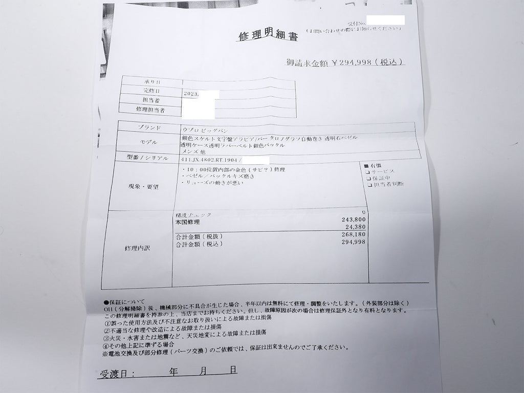 | 付属品 | 保証書;箱;タグ;修理明細書のコピー;証明書 |