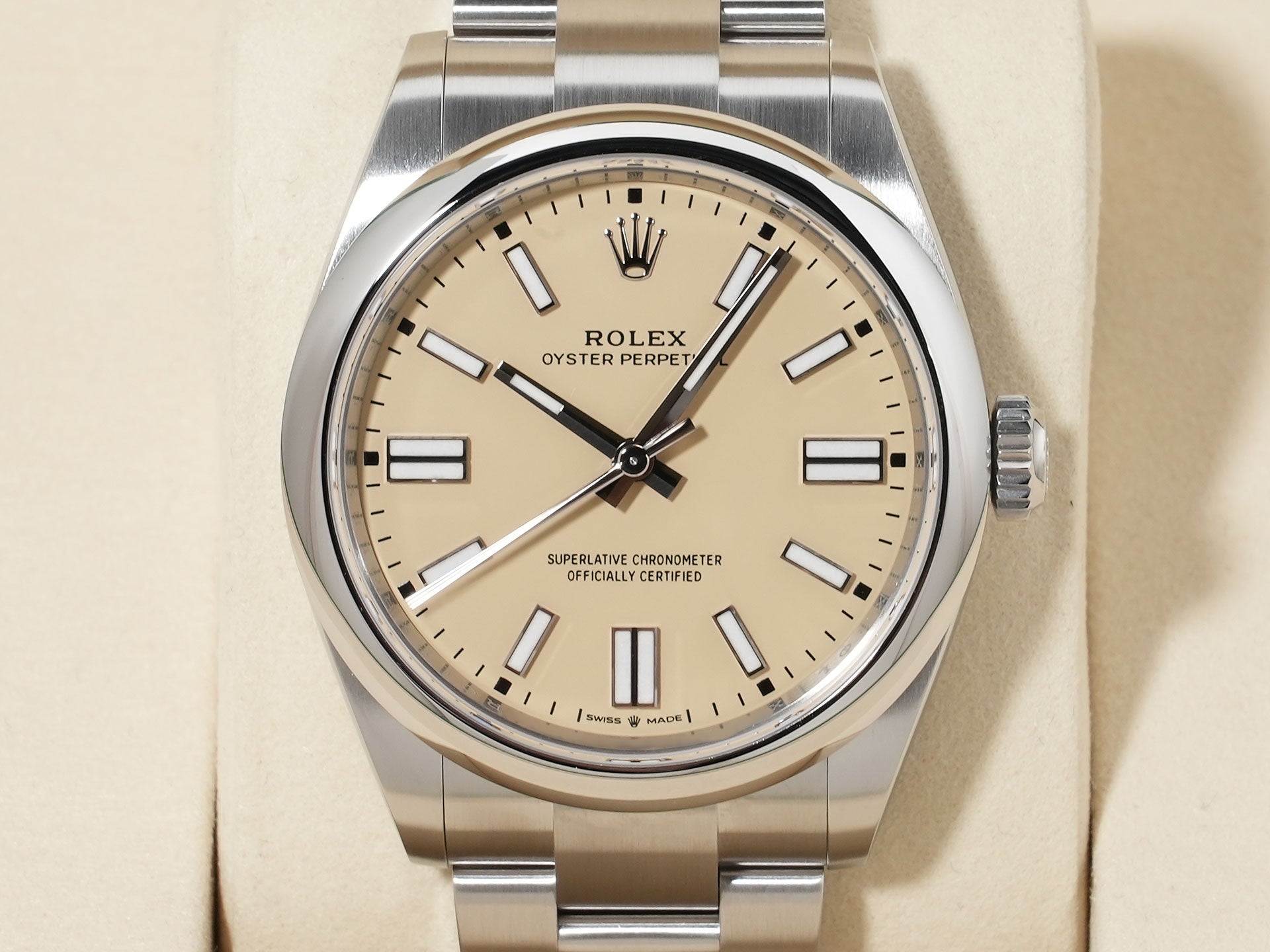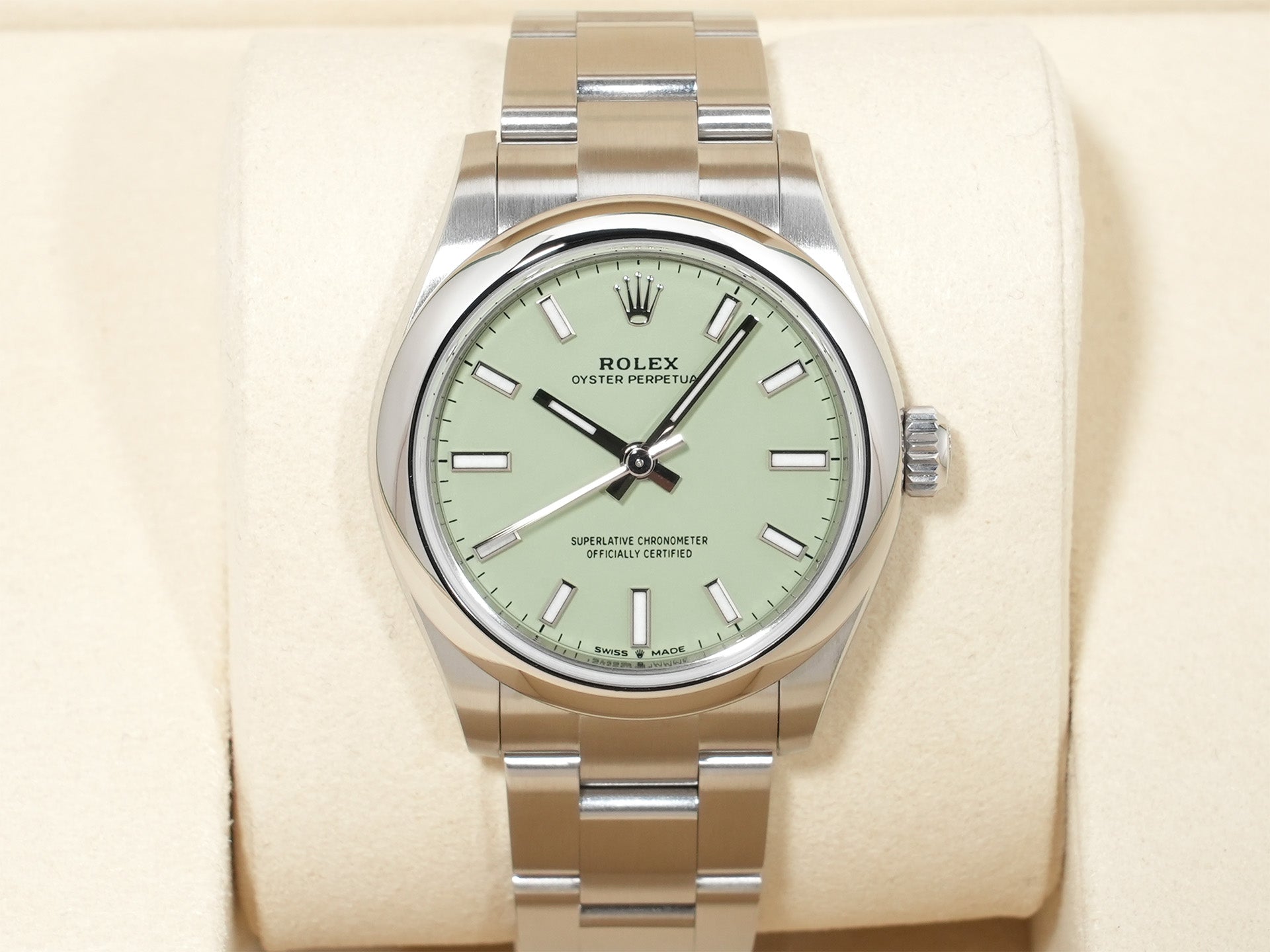 オイスターパーペチュアルはシンプルなデザインながら、多彩な文字盤カラーやインデックスが揃っており、個性を演出しやすい点が魅力。ファッションとも好相性です。